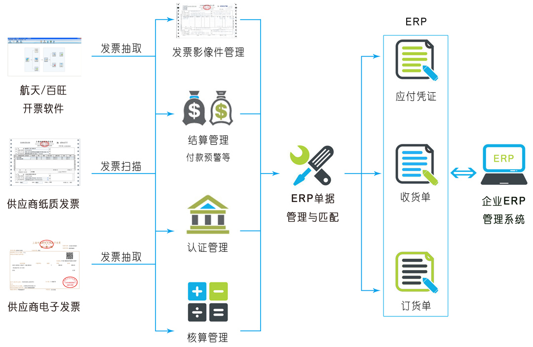 稅航增值稅進(jìn)項(xiàng)發(fā)票管理解決方案,利用從業(yè)務(wù)系統(tǒng)的供應(yīng)商信息中抽取的數(shù)據(jù)和掃描發(fā)票獲得的數(shù)據(jù),通過(guò)稅航進(jìn)項(xiàng)發(fā)票管理平臺(tái)及稅控?cái)?shù)據(jù)接口,實(shí)現(xiàn)自動(dòng)識(shí)別認(rèn)證、生成增值稅進(jìn)項(xiàng)明細(xì)表,徹底消除進(jìn)項(xiàng)發(fā)票流程中的重復(fù)勞動(dòng),保證進(jìn)項(xiàng)數(shù)據(jù)的正確性和一致性,統(tǒng)一管理增值稅數(shù)據(jù)和業(yè)務(wù)數(shù)據(jù),實(shí)現(xiàn)靈活對(duì)比查詢,輕松轉(zhuǎn)換成企業(yè)ERP采購(gòu)訂單或者應(yīng)付憑證。更多進(jìn)項(xiàng)報(bào)表可通過(guò)發(fā)票管理平臺(tái)統(tǒng)一生成,客觀、真實(shí)、及時(shí) 。實(shí)現(xiàn)原理圖如下: